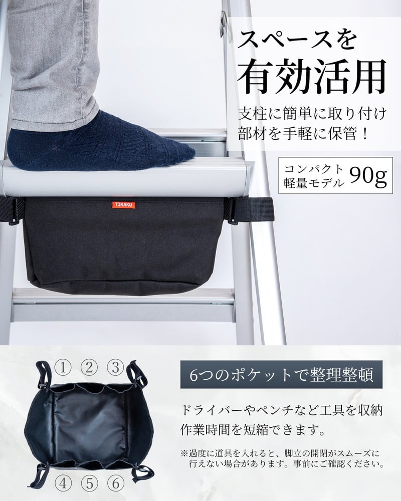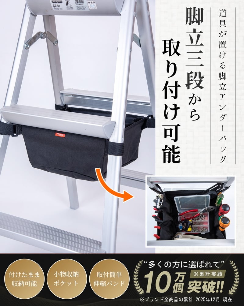 【取り付け簡単な脚立専用アンダーバッグ】伸縮マジックテープで支柱にワンタッチ装着。取り外し不要で脚立の開閉もそのまま可能。作業中に道具を探す手間が省け、効率が大幅に向上します。DIY、清掃、ガーデニングなど幅広い用途で活躍。必要な工具や小物を手元にまとめて作業をスムーズに進められる便利なアイテムです。
