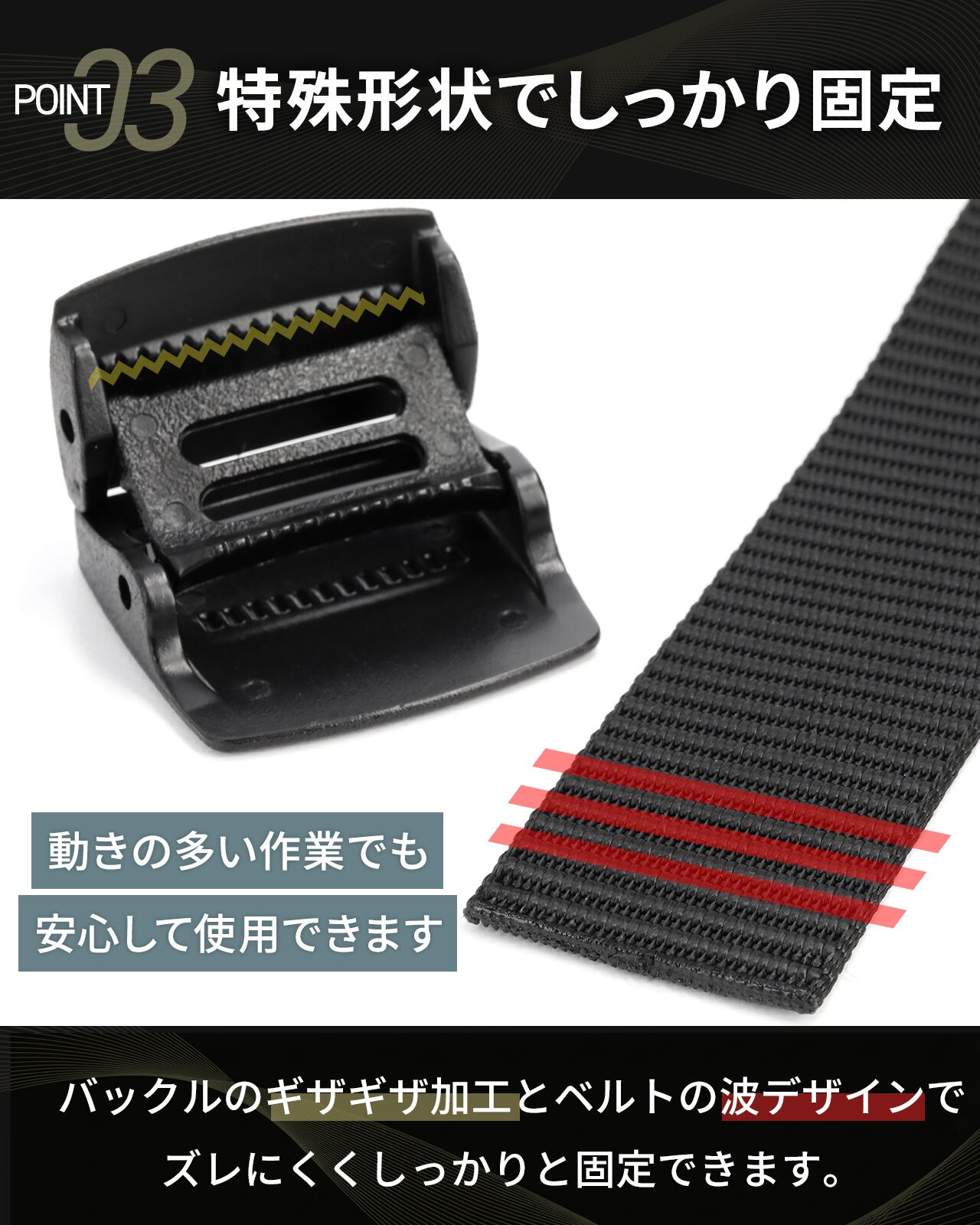 【非金属バックル】錆びる心配もなく、長期間使用しても劣化しにくいのが特徴です。金属を使用しない樹脂製バックルなので、金属アレルギーで肌が荒れる心配がありません。また空港の出入国前の手荷物検査でベルトの着脱は不要です。